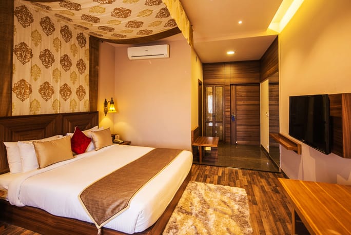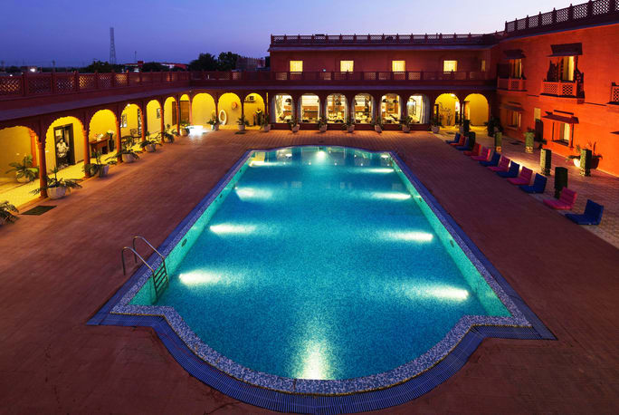 ROOMS AND SUITES - The current room inventory is 40 Luxury and 8 Suite rooms. Each room is made in contemporary design with the latest technology available today. Wooden flooring, pocket spring mattresses with choice of pillows, Sofa, Ottoman, Writing Chair and Desk form the basics of the room. Latest in technology, each room offers complimentary high-speed Wifi, RFID operated doors, Vesta At Your Service phone service, 39inch LED TVs, International IEC power sockets, high pressure shower jets and modern bathrooms. The bed is adorned by a large beautiful traditional Rajasthani 'canopy', something the Maharajas use to sleep under. This beautiful adornment becomes the design feature of the room.The central light piece of the room has been crafted and designed in traditional Rajasthani eloquence to accentuate and complete the beauty of the room.
