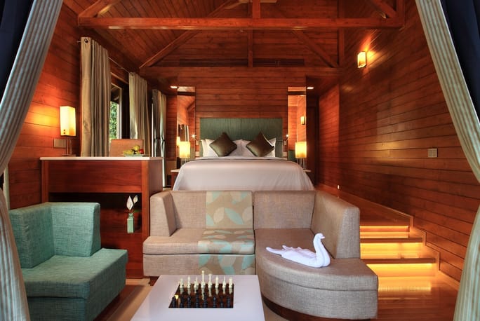 Suite Cottage - The Suite cottage expresses the joy of living large. The wall-to-wall wood panelling and the colour combination recreates the soft hues of nature. It promises more privacy and offers a magnificent view of the dense greenery around. This spacious accommodation comprises of a separate bedroom and a living area. The cottage is endowed with a unique private sundeck on the east with recliners that will tempt you to spend your time in complete idleness.