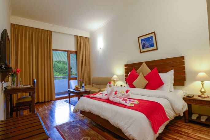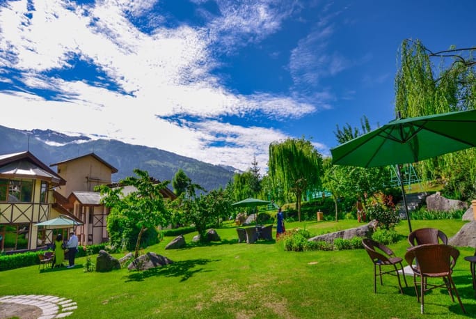the enchanting home to the singing bird, the meandering river Beas, the majestic mountains ,verdant green valleys and the glorious glacier seemingly within a hand's reach- is a luxurious four star property at a height of 8500ft.The trio of the white ranges of Dhauladhar, deo tibba and the Hanuman tibba provide a mesmerising view here.This is the Resort where you can escape the trappings of the city life and get attuned to hearing the whispering of the winds , the mystical sounds of the river Beas and the waterfalls.The River Retreat Block, the Orchard bungalow and the Glacier point house 64 tastefully appointed rooms with magnificent views and overlooking manicured lawns. Rooms overlook the river Beas or snow lad mountains. Multicuisine restaurants - Dhaam and Kalaar, Italian restaurant Gazebo and an open air restaurant by the riverside for candlelight dinners - all add up to a gastronomic experience. Our well stocked bar- The Malana Bar raises your spirits literally!We breed our own trout and guests can actually get their own catch cooked and served.Our on site entertainment includes a well equipped gym, a children's activity corner, pool tables, video games, board games, table tennis and skating.Rejuvenating and relaxing spa at the Resort totally relieves of all stresses.Solang Valley Resorts boasts of a dedicated travel desk, concierge services, wifi throughout the property .A special mention of evening entertainment is a must here with a live performance of Himachali folk dance being a star attraction.